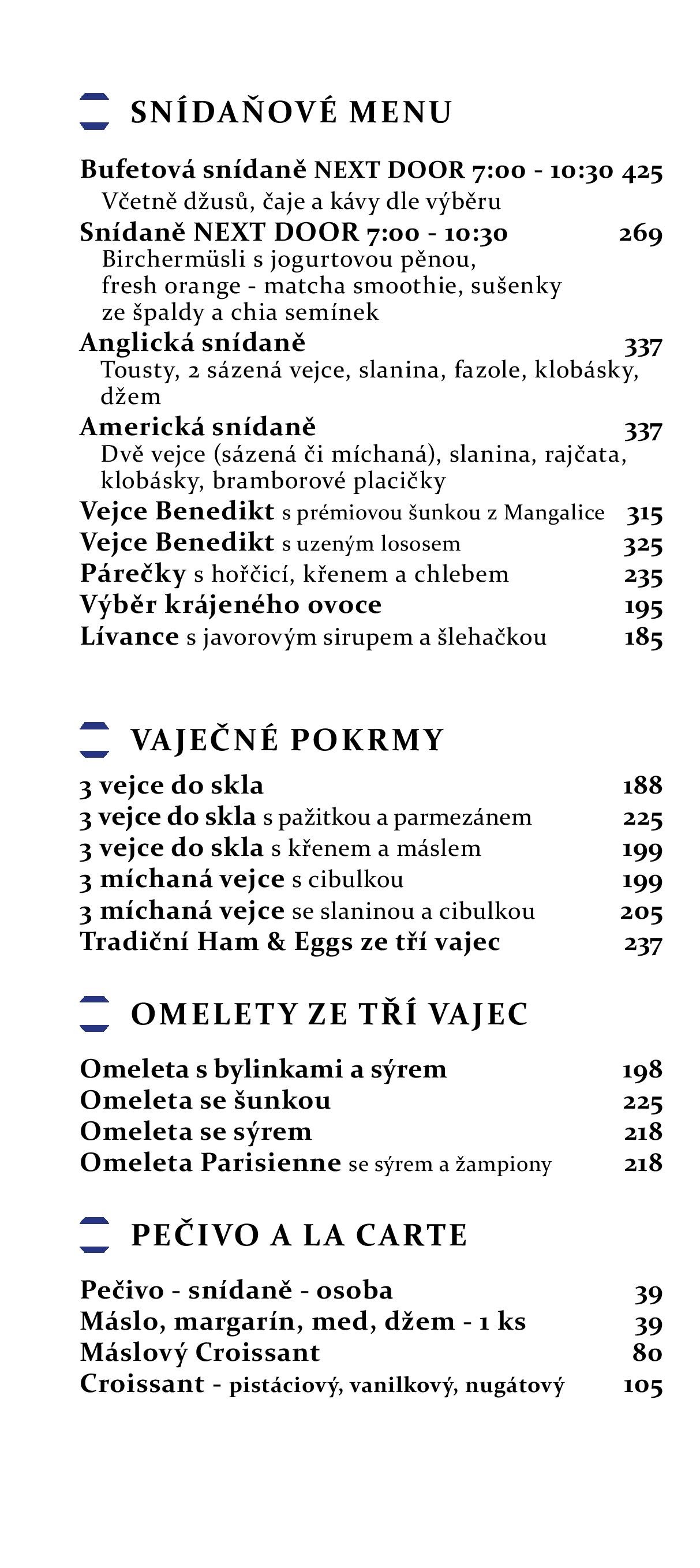 Restaurace Next Door je díky své lokalitě a vyhlášenému servisu ideálním místem pro pracovní setkání nebo rodinné oslavy a to již od časného rána. Začněte svůj den právě u nás.